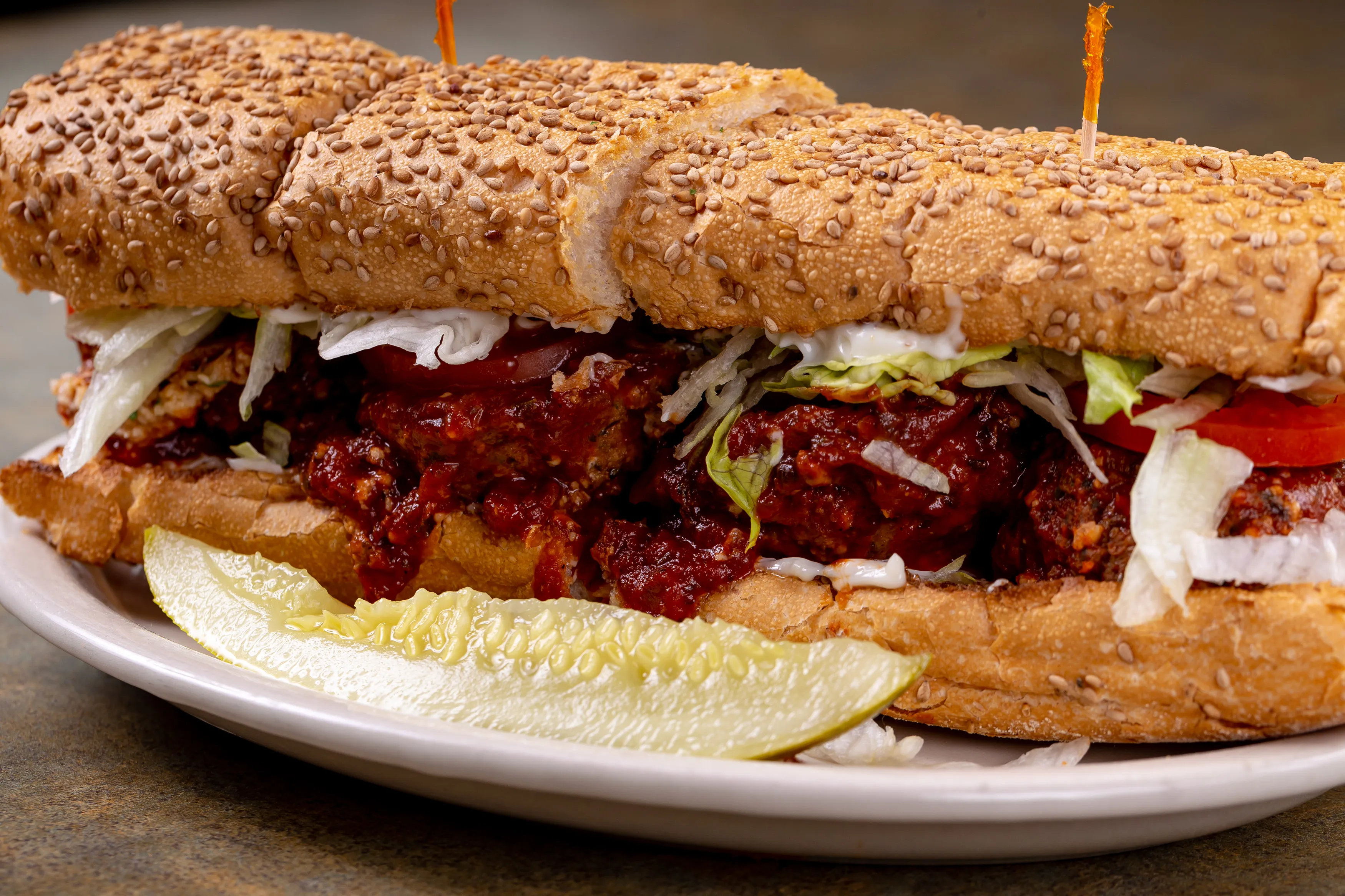 Our delicious homemade meatballs and red saucee served on fresh poboy bread