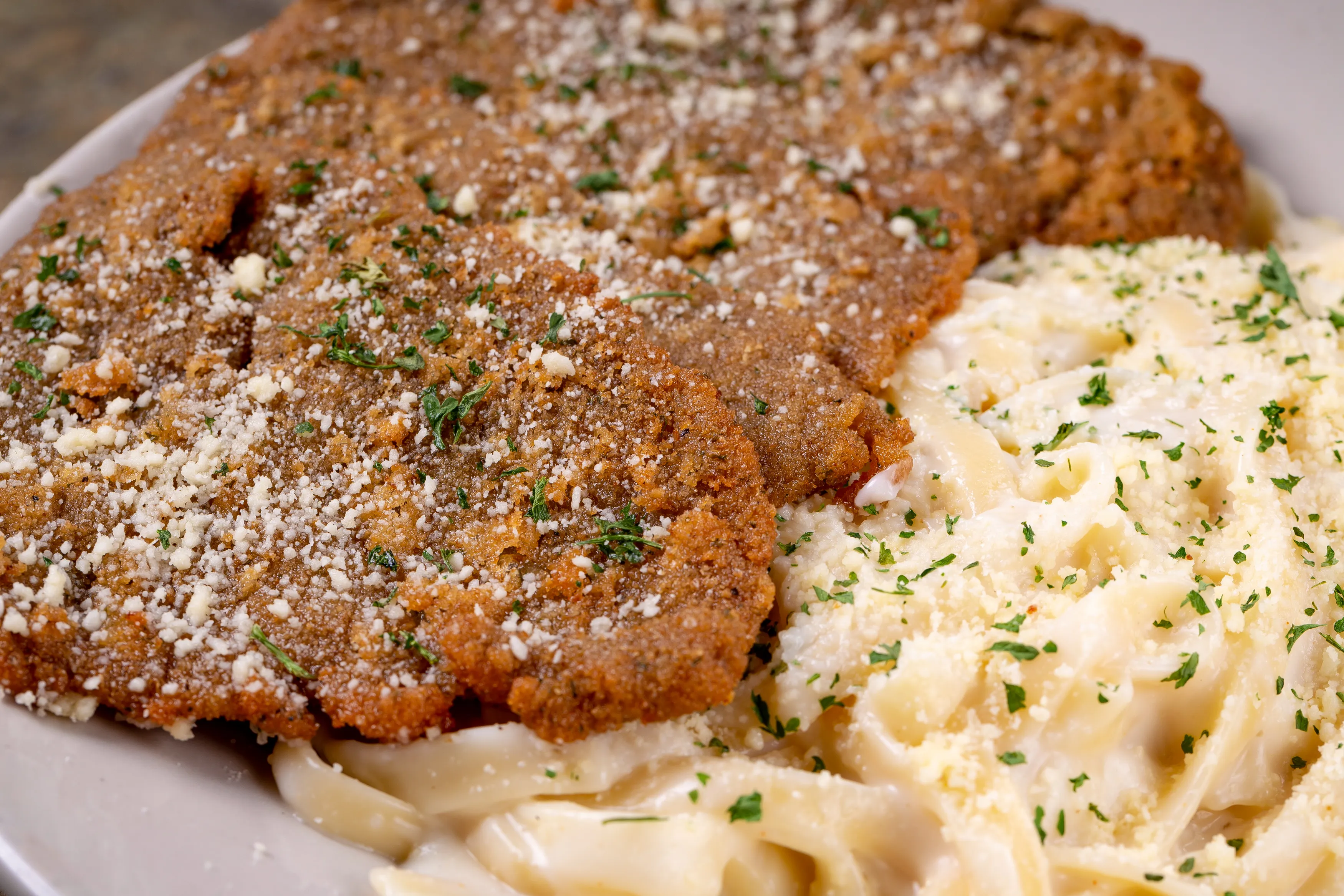 Golden fried veal topped with our classic cream sauce and fettuccini pasta. Served with salad